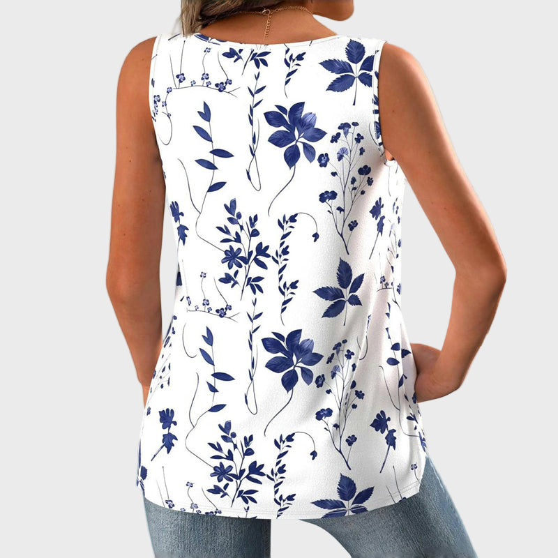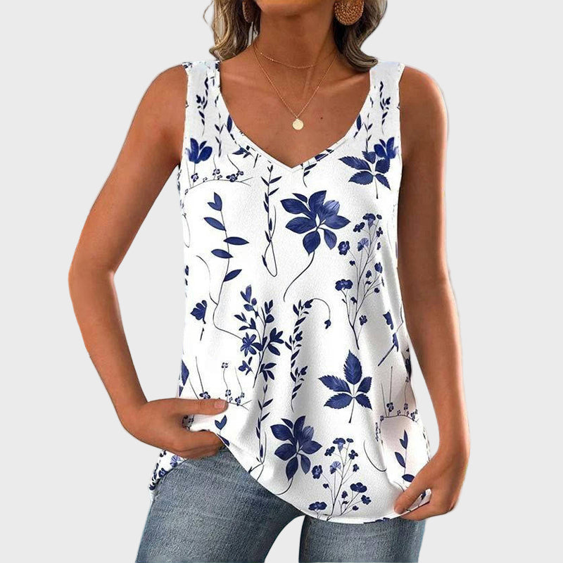 Uživajte v svežini poletjamodrimi cvetličnimi vzorci na beli podlagi prinaša svežino in stil. Njena sproščena silhueta nudi udobje in svobodo gibanja, medtem ko V-izrez dodaja ženstvenost in eleganco. Idealna za vsakodnevne in poletne kombinacije!