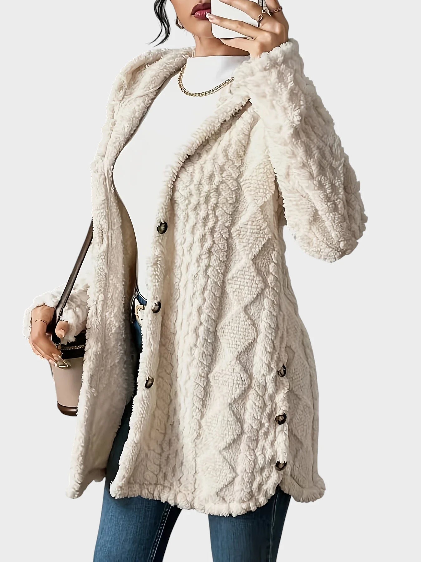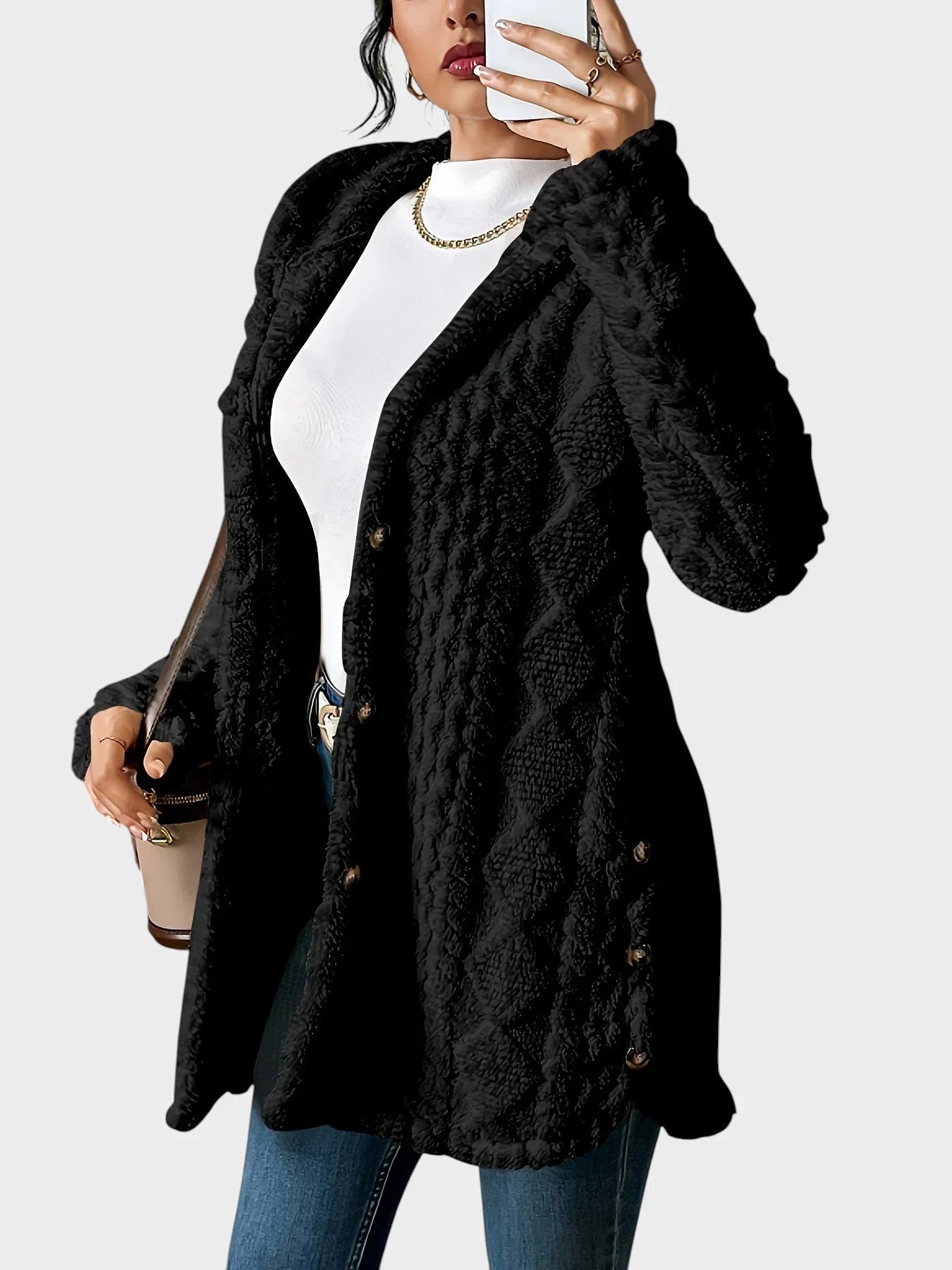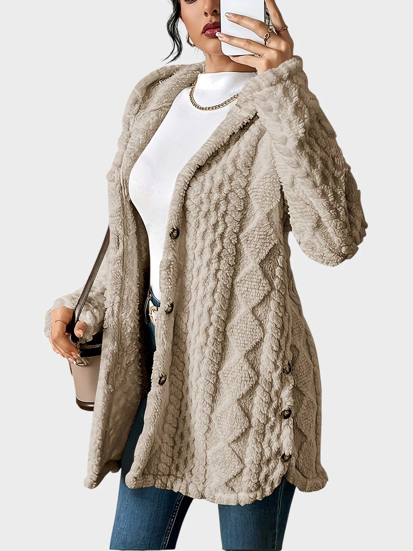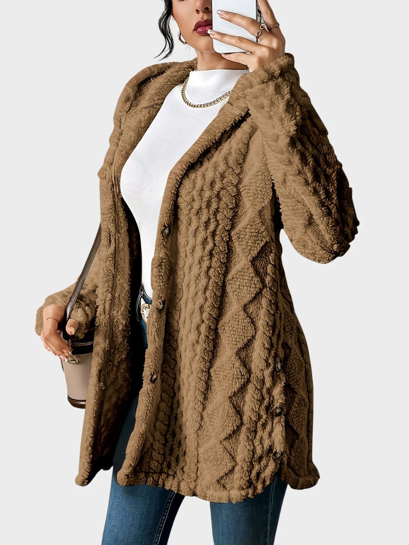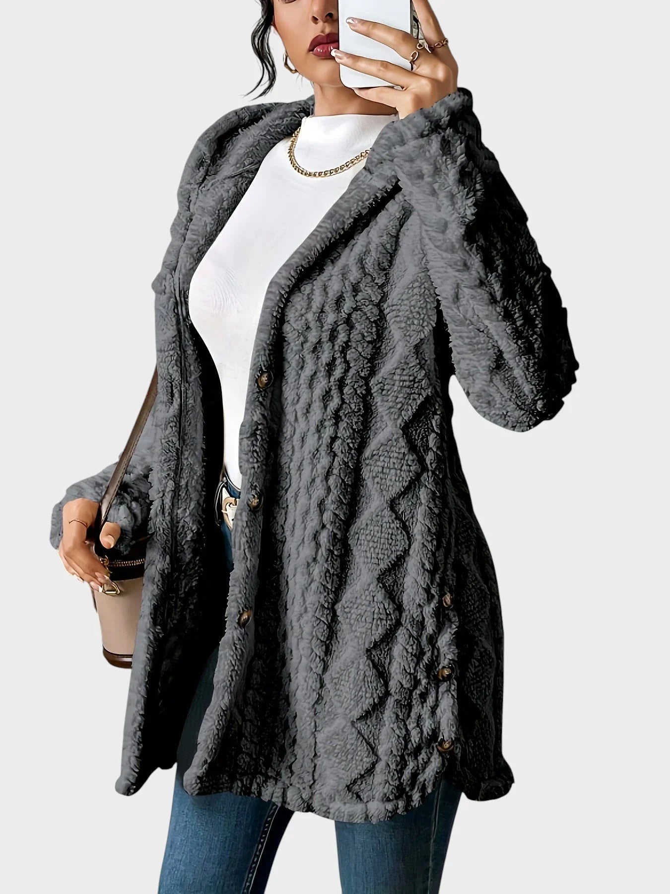 Brezčasna eleganca: Šik silhueta s kapuco in izpopolnjen pleten vzorec dodajata sofisticiranost vsakodnevnim videzom.