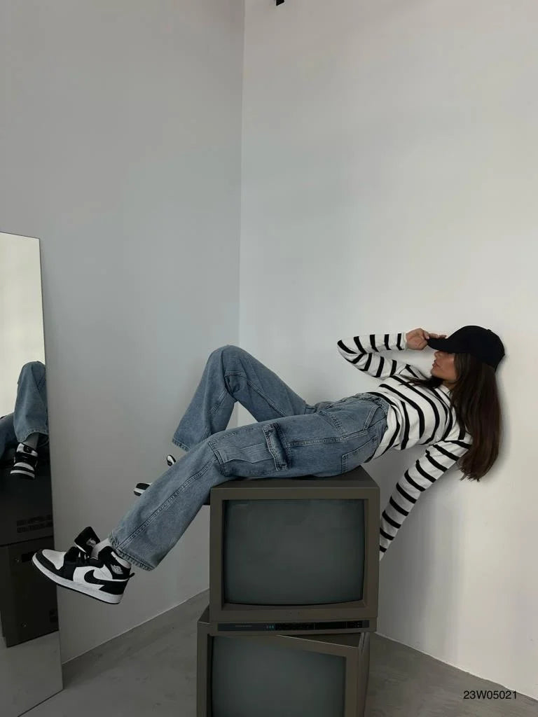 Upgrade your streetwear with the Felda cargo jeans. Thanks to the low-rise design and relaxed fit, these jeans offer the perfect balance between comfort and style. The striking cargo pockets and contrasting stitching provide a rugged, modern look that effortlessly aligns with the urban lifestyle.